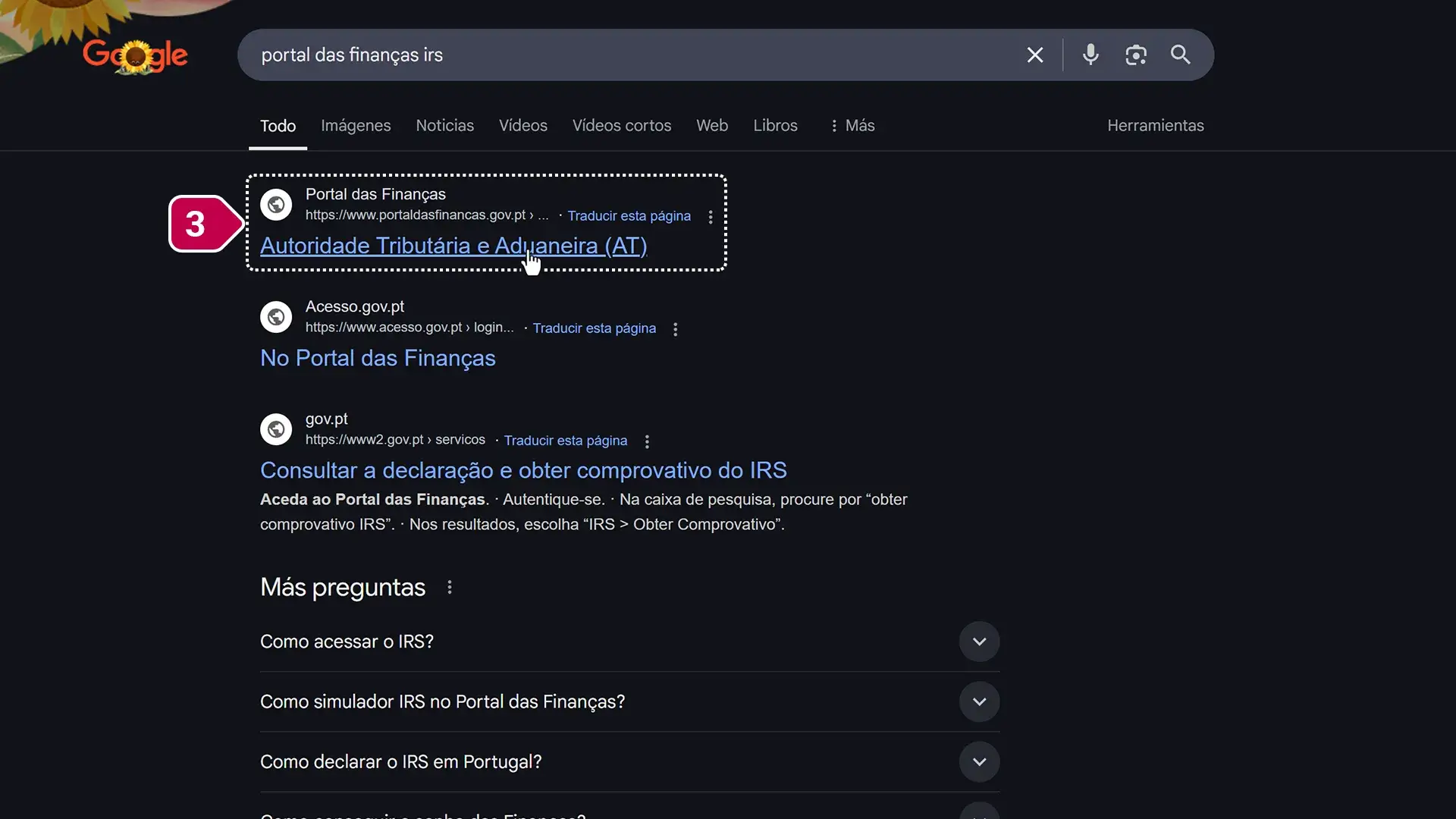 - Nos resultados de pesquisa, clicar no site da Autoridade Tributária e Aduaneira (AT).