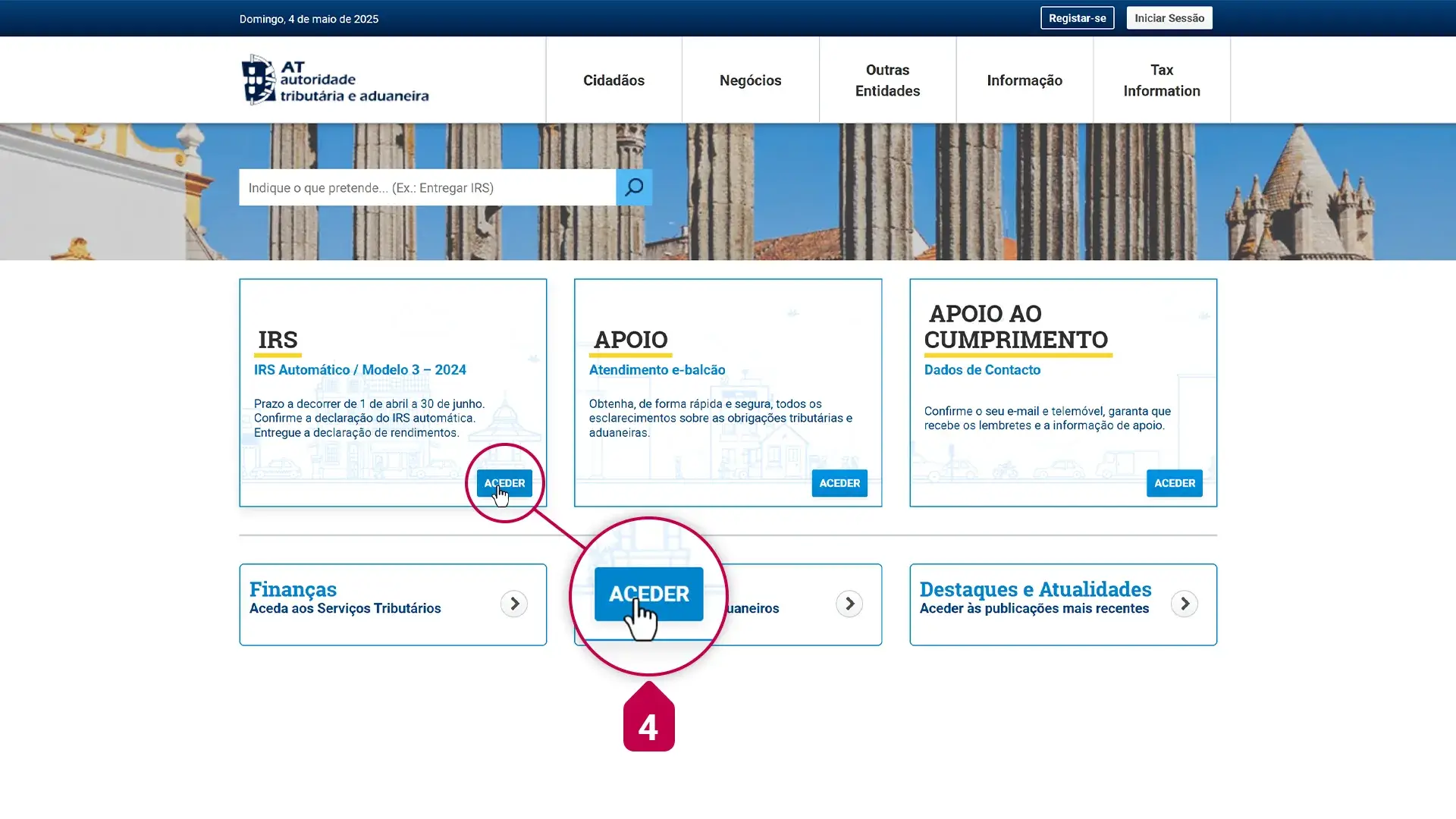 - No lado esquerdo, onde está escrito “IRS”, clicar em “Aceder”.