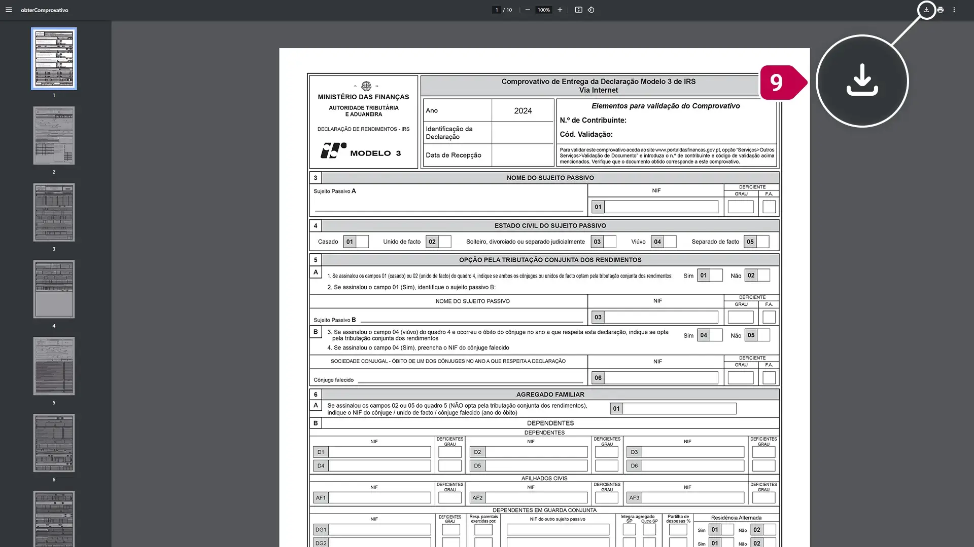 - No canto superior direito do comprovativo de entrega da Declaração Modelo 3 de IRS, clicar no símbolo para descarregar o documento.