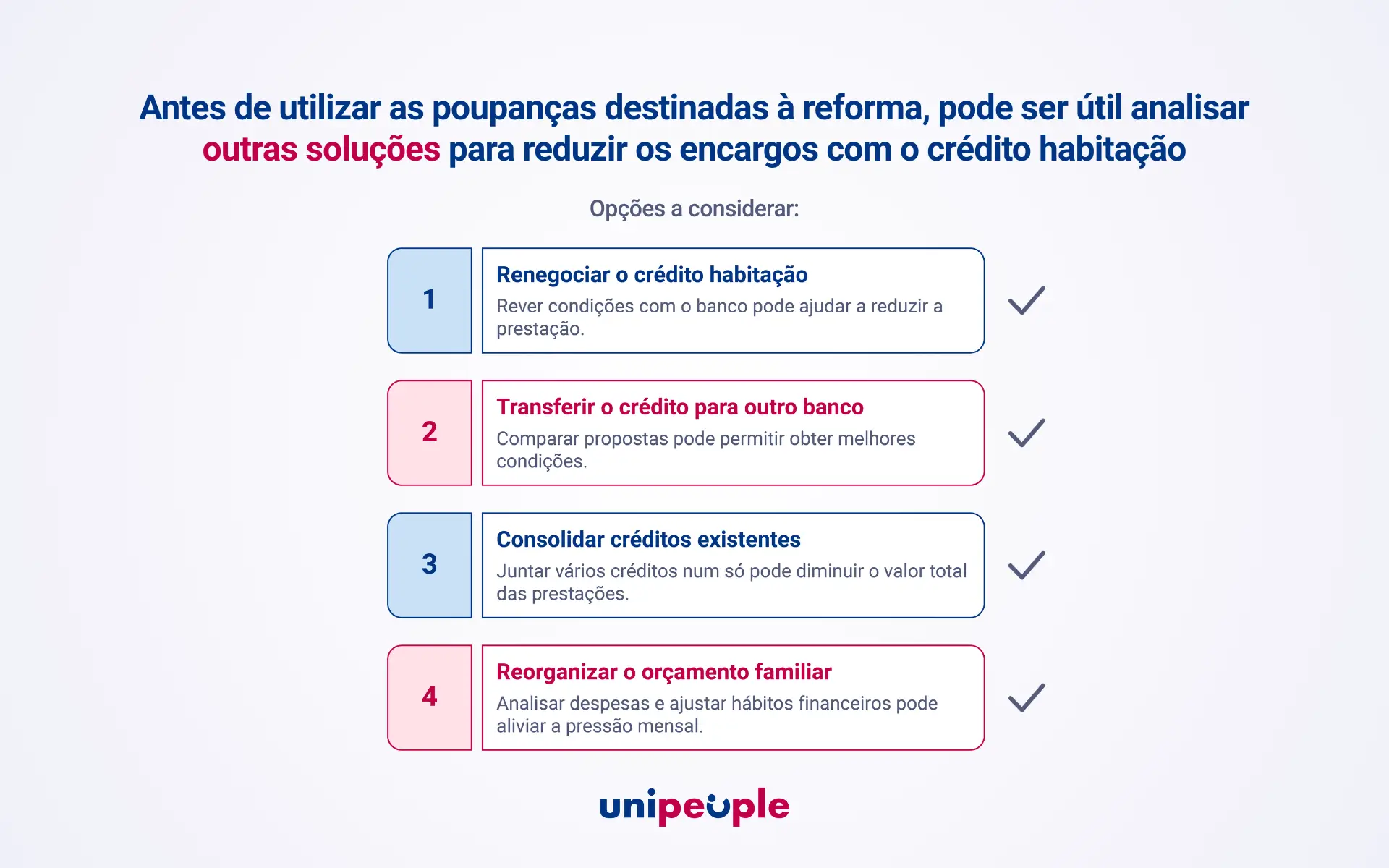 Antes de recorrer às poupanças destinadas à reforma, pode ser útil analisar outras soluções financeiras que permitam reduzir os encargos mensais com o crédito habitação.