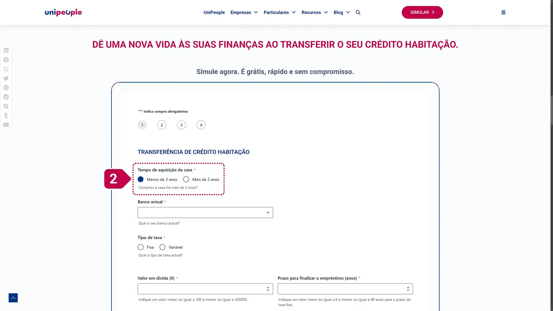 Continue a ler para conhecer ao detalhe o simulador de transferência de crédito habitação UniPeople e como preencher cada campo para avançar com o pedido.