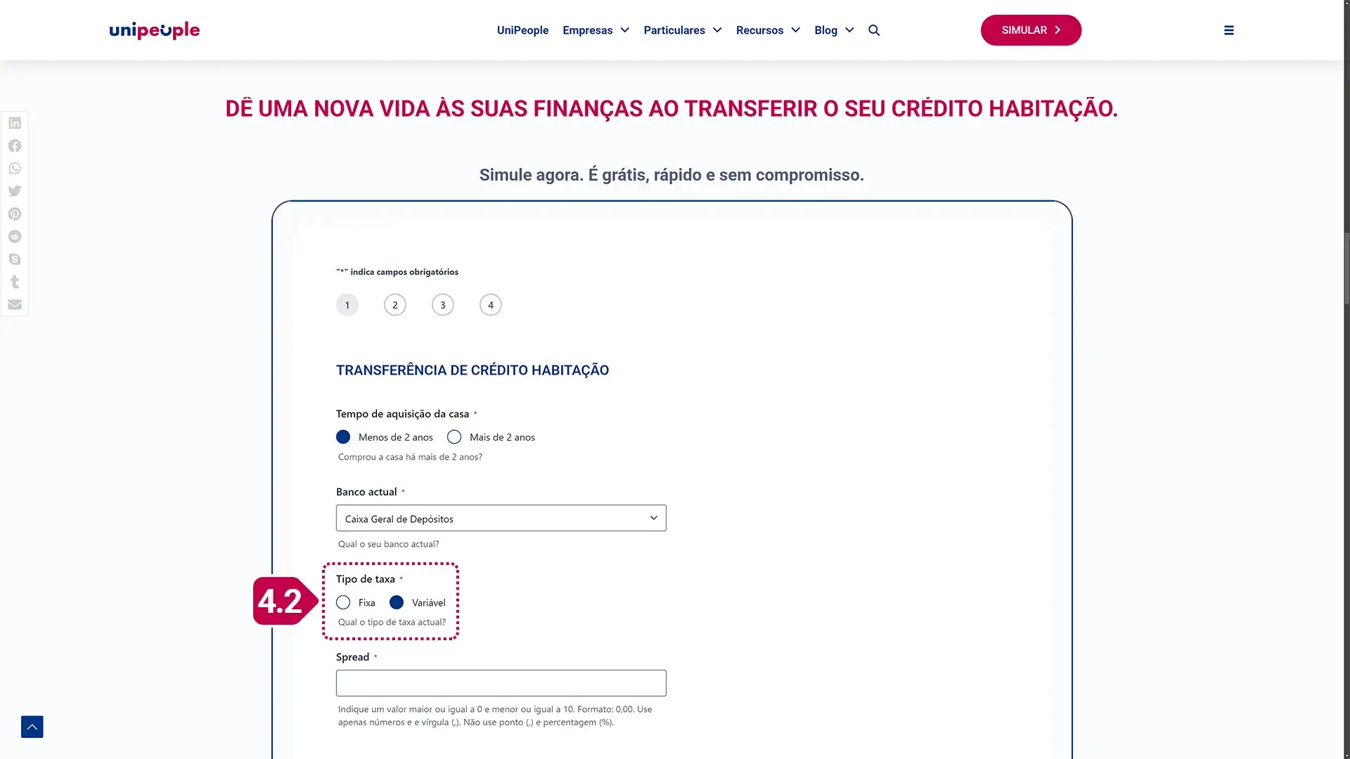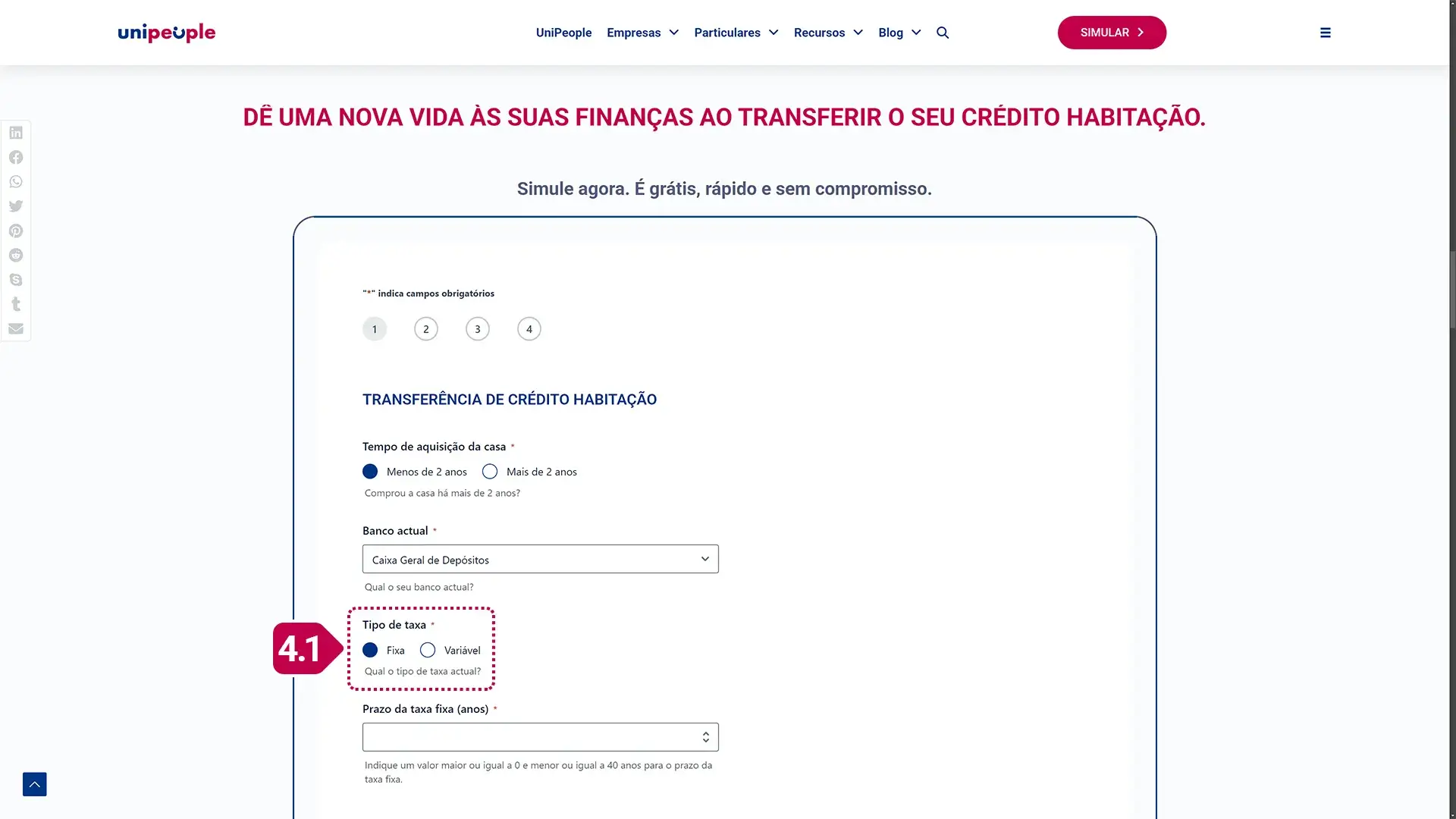4 – Ao chegar ao passo 4, poderá escolher entre duas opções: taxa fixa (4.1) ou taxa variável (4.2). Veja a seguir.