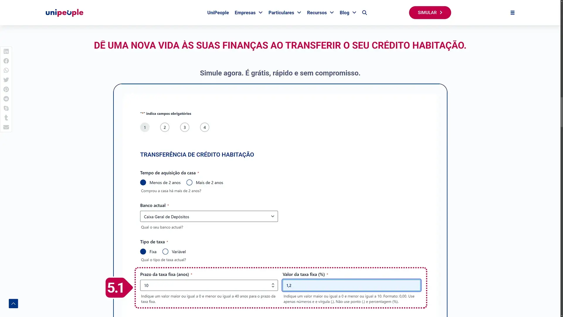5.1 – Se taxa escolhida no passo 4 é fixa, nesta etapa indique o prazo em anos: por exemplo, 10 anos. No próximo campo, indique o valor da taxa associada ao seu empréstimo de crédito habitação atual. Por exemplo, 1,2. Não use sinal de percentagem (%) neste campo, pois o sistema assume automaticamente.
