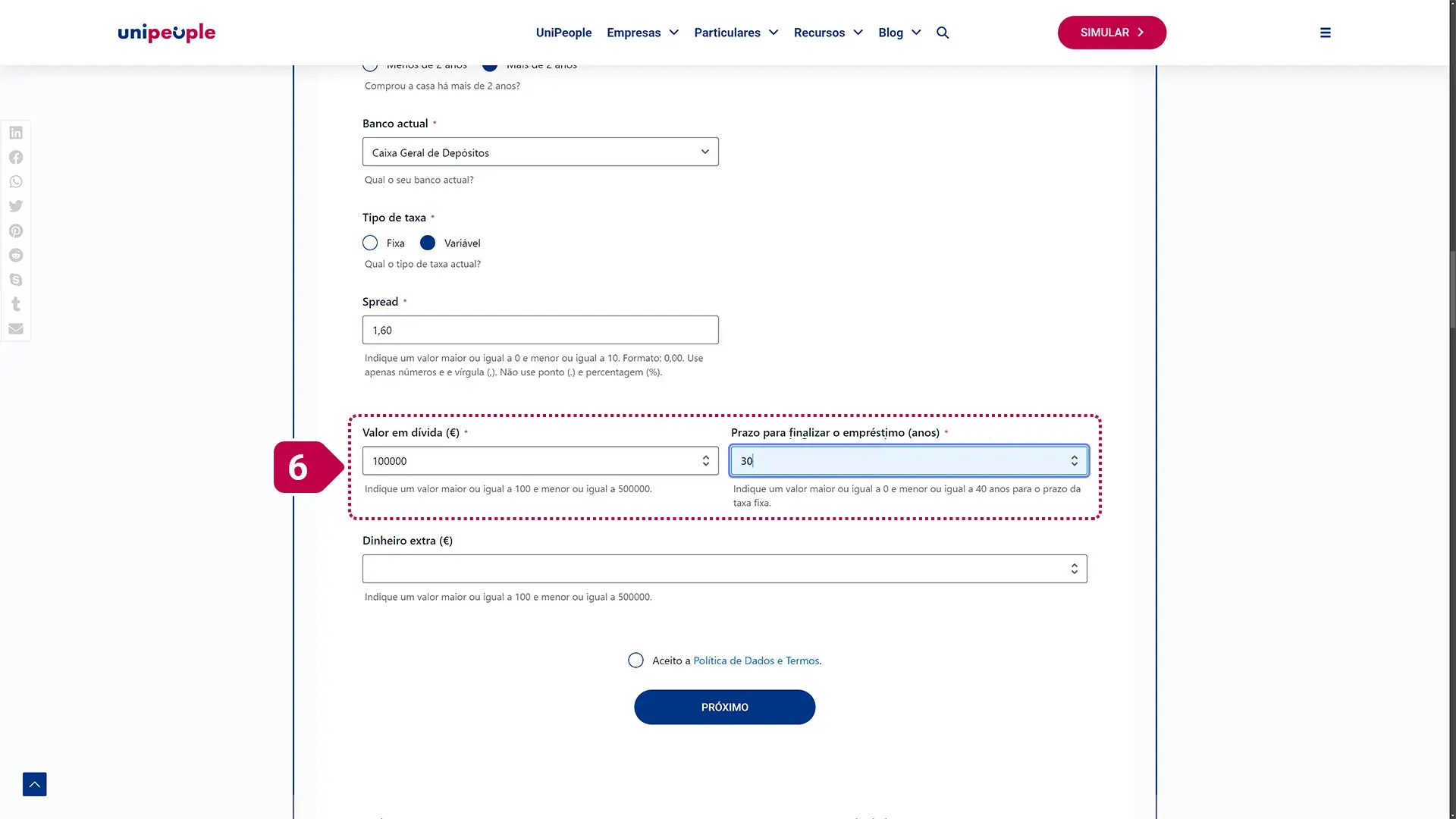 6 – Indique o valor da dívida: por exemplo, 300.000€ e o prazo para finalizar o empréstimo (em anos): por exemplo, 30 anos.
