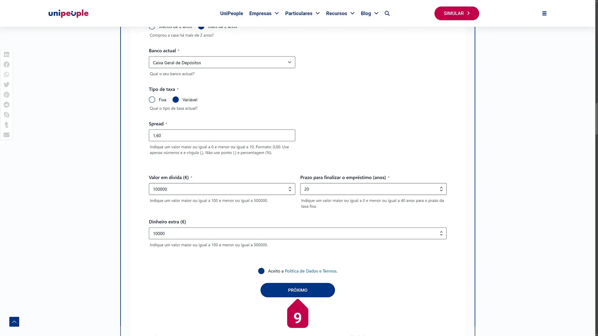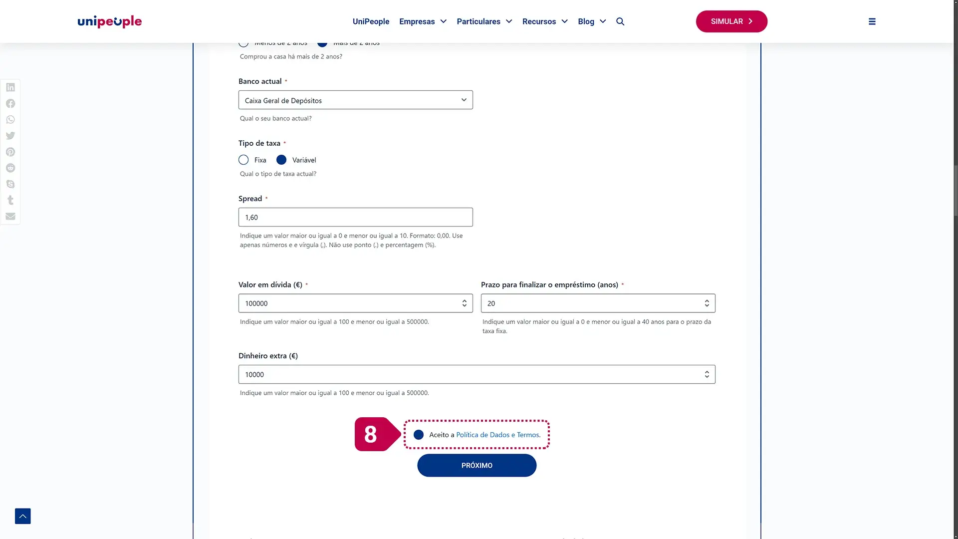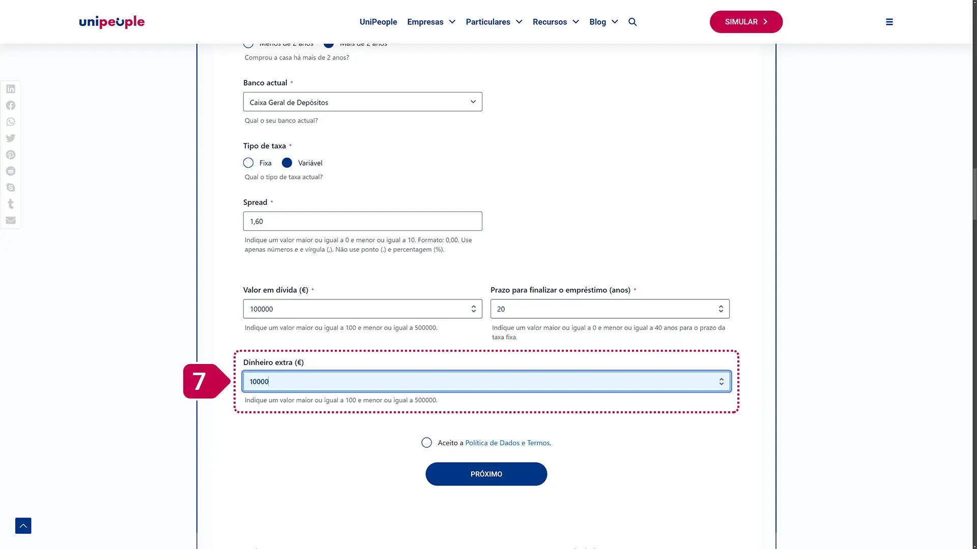 7 – Indique se precisa de dinheiro extra: poderá definir um valor entre 100€ e 500.000€. Este campo não é obrigatório.