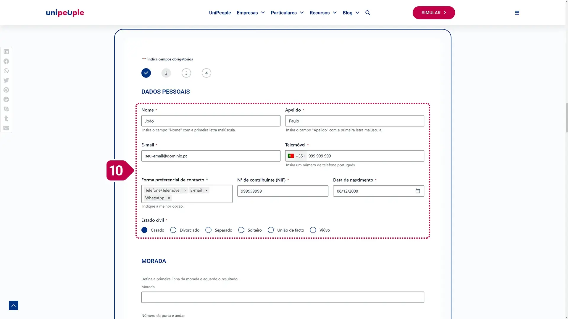 10 — Comece por preencher o seu nome, apelido, e-mail e telemóvel. Indique se possui nacionalidade portuguesa. Indique também a forma preferencial de convite, número de contribuinte (NIF), data de nascimento e estado civil.