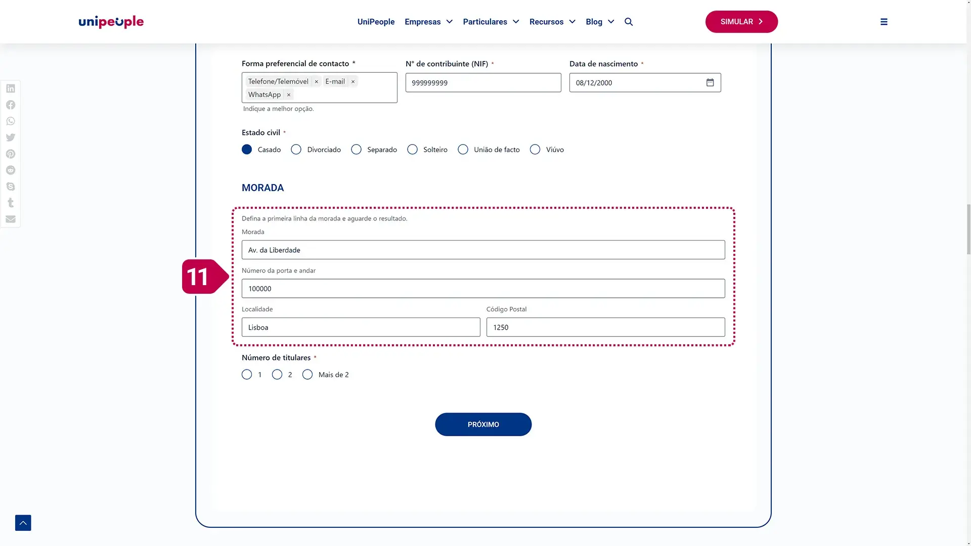 11 – Adicione a morada completa, indicando o número de porta e andar, a localidade e o código postal.